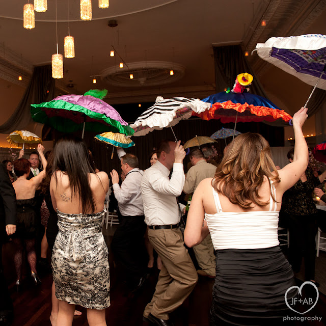 I included some fun shots from the photo "booth" we set up at the reception. Christi shopped around for some festive props and her guests had a blast modeling them for us! Between the photo booth props and the colorful silken umbrellas that the groom's Uncle Eddie brought for a mummers dance, the reception festivities took on a carnival feel.