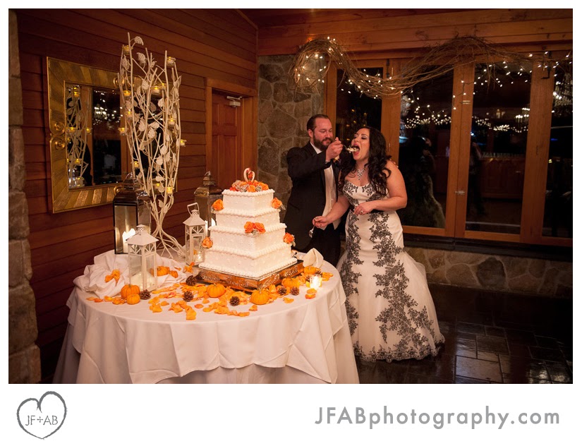 I have to admit, when Cara first contacted me about her photographing her wedding, I was so excited by the prospect of shooting our first event on Halloween. I love Halloween and Cara said it's her favorite holiday too. In fact, Brent proposed to her at a Halloween party they hosted the year before their wedding. But when it came time to plan their wedding, Cara was clear that they were going for classy, not kitschy. They included masquerade masks as favors for their guests, but this was no costume party. Their centerpieces and place cards and the candy table at the end of the night all paid homage to Halloween in a fun yet fancy way. And the Stroudsmoor was the perfect backdrop! The stonework and fireplace fixtures (both at their ceremony and reception sites) gave the event a warm gothic feel. Cara looked amazing in her gown, which incorporated a touch of black along with the traditional white (like her engagement ring which incorporates both black and white diamonds). Her black bridesmaids' dresses were awesome too, with bead work detailing, cut out backs and fun fur boleros to keep them toasty. Cara and Brent, thank you for trusting me to photograph your day. Congratulations on your marriage and for hosting a kick-ass wedding! Scroll on to view some of my favorite photos of the day.